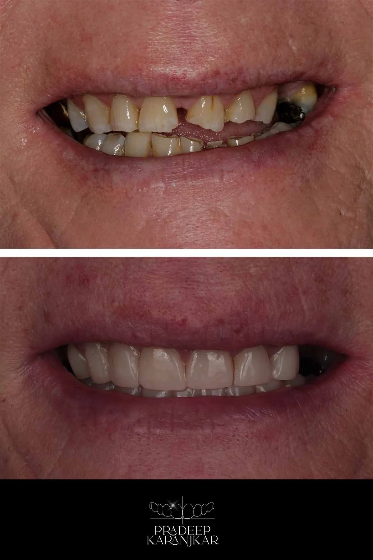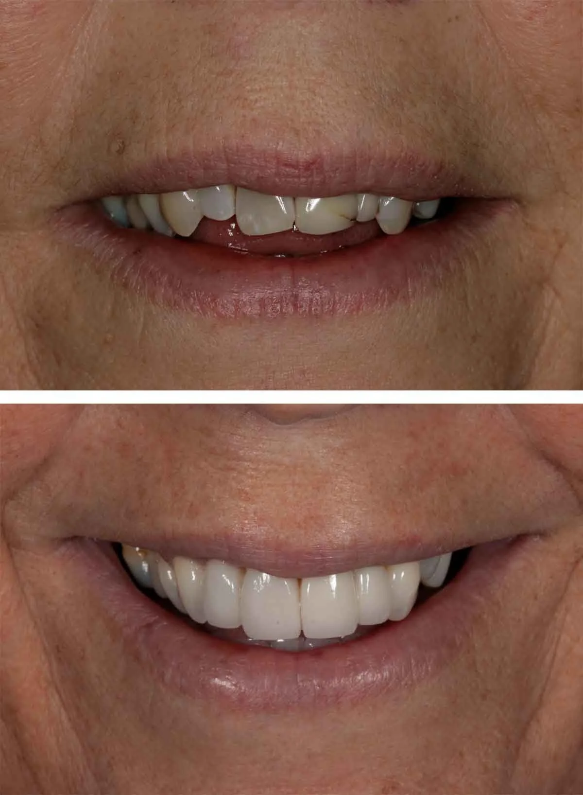 Broken down teeth and a gap between teeth. Two crowns on the upper teeth put a smile back on.