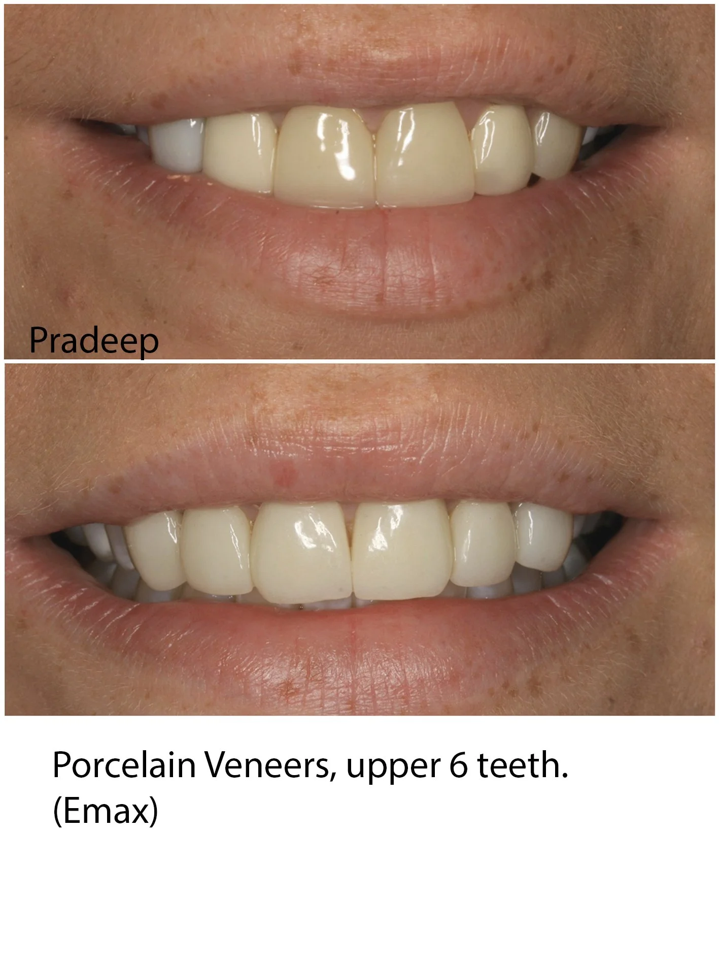 This patient had previous veneers that were made many years ago. Each veneer was made at different times. This led to the colours not matching one another. All veneers were replaced with Emax Porcelain veneers leading to a uniform colour. A happy patient.