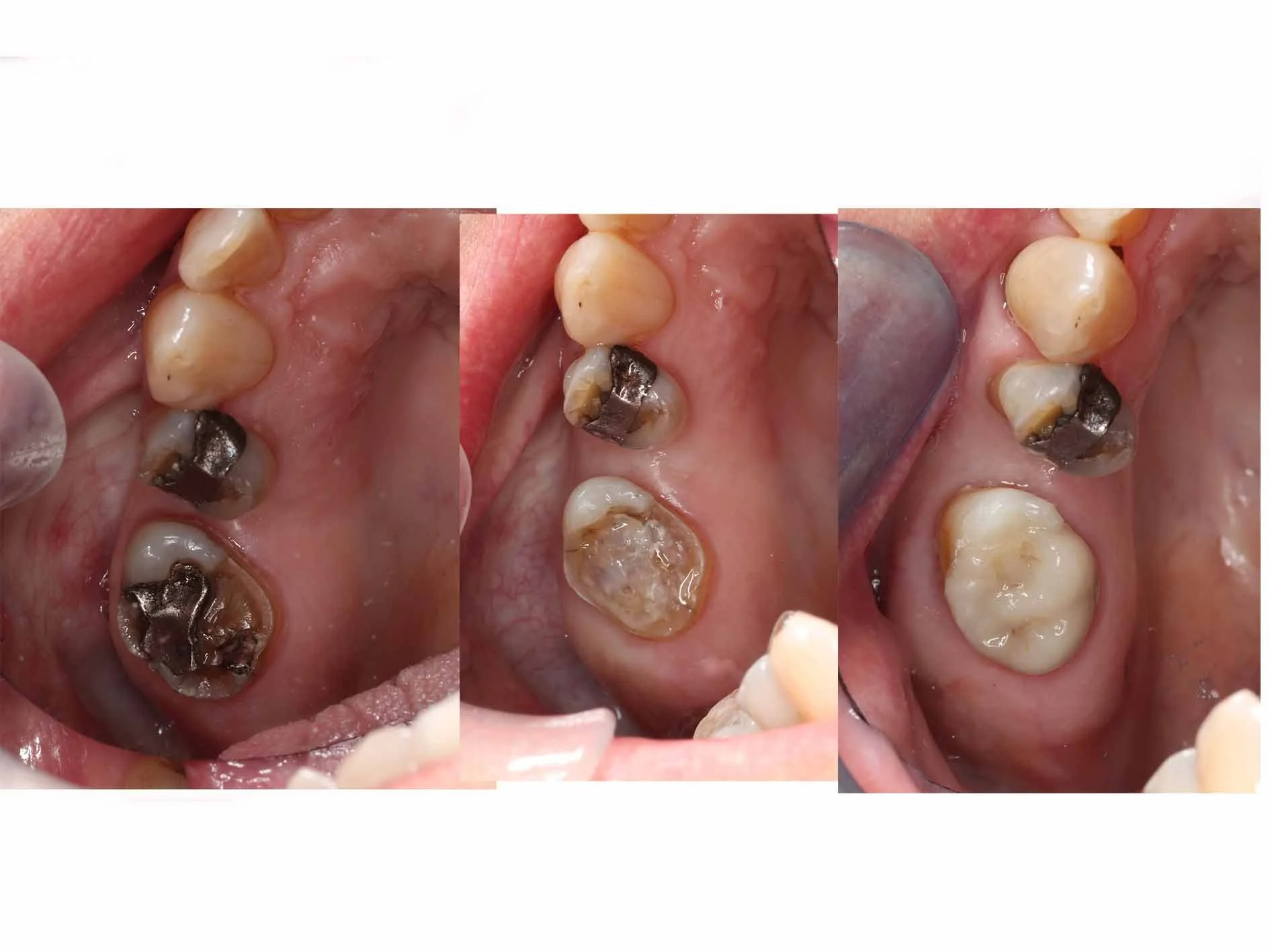 Often the tooth is quite broken down and requires a large restoration. In this case, an Emax onlay was made for the last back tooth. It is more conservative than a conventional crown, has good aesthetics and can last long.