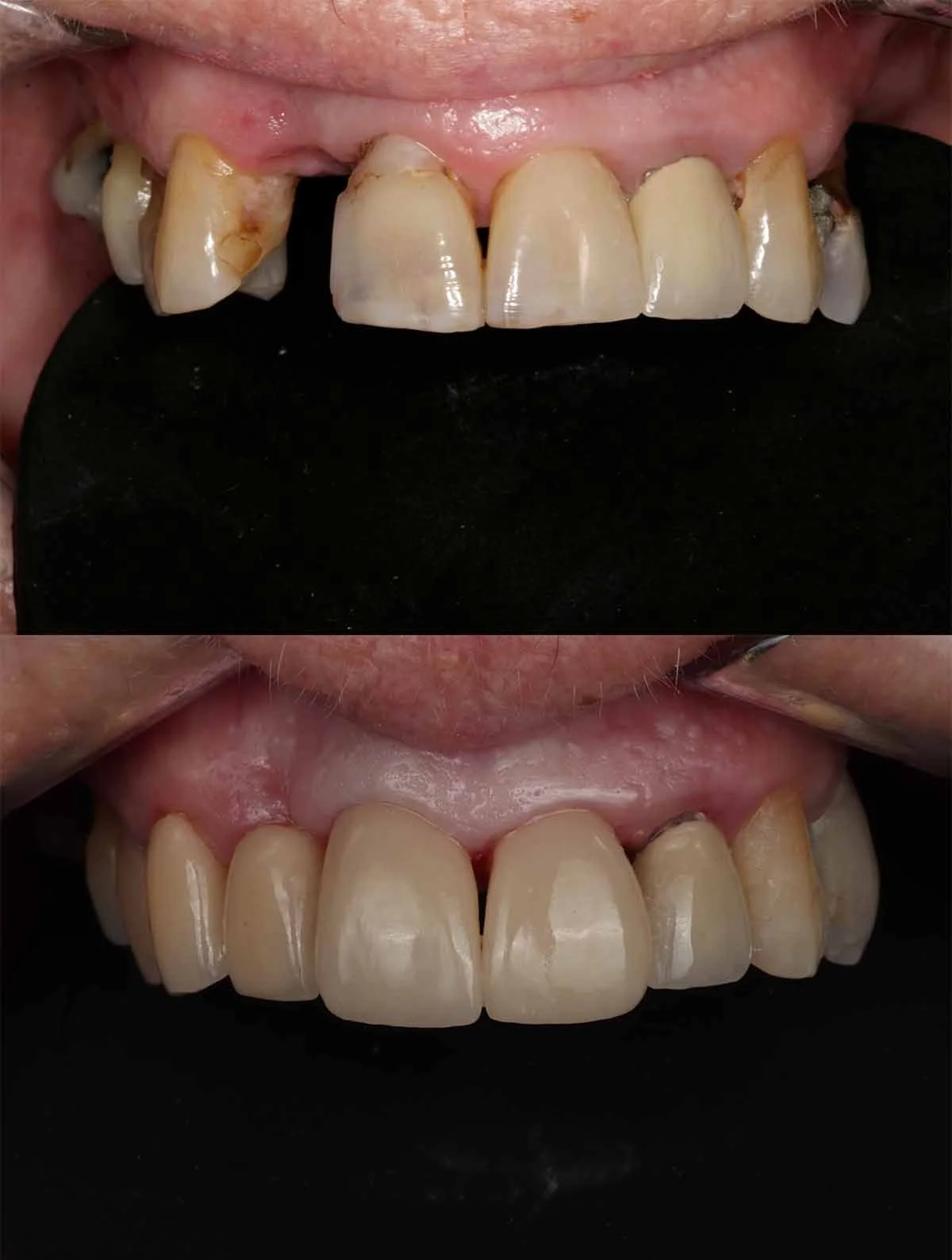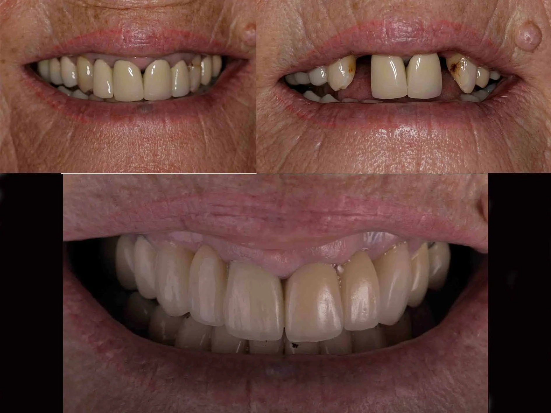 A patient had failing crowns and was unhappy with the appearance as the existing crowns showed dark margins of the crowns and the colours of the teeth did not look natural. Two teeth had to be removed as they were not in a position to be saved. Teeth replaced with bridges (metal free), and veneers were placed on 2 teeth. The patient was very pleased with the result and now smiles confidently.